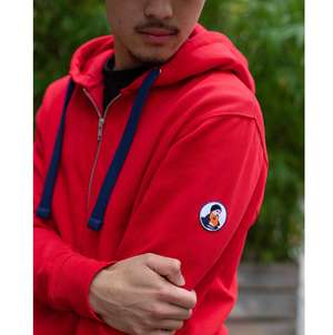 Sweat à capuche rouge zippé unisexe iconique, coupe normale.